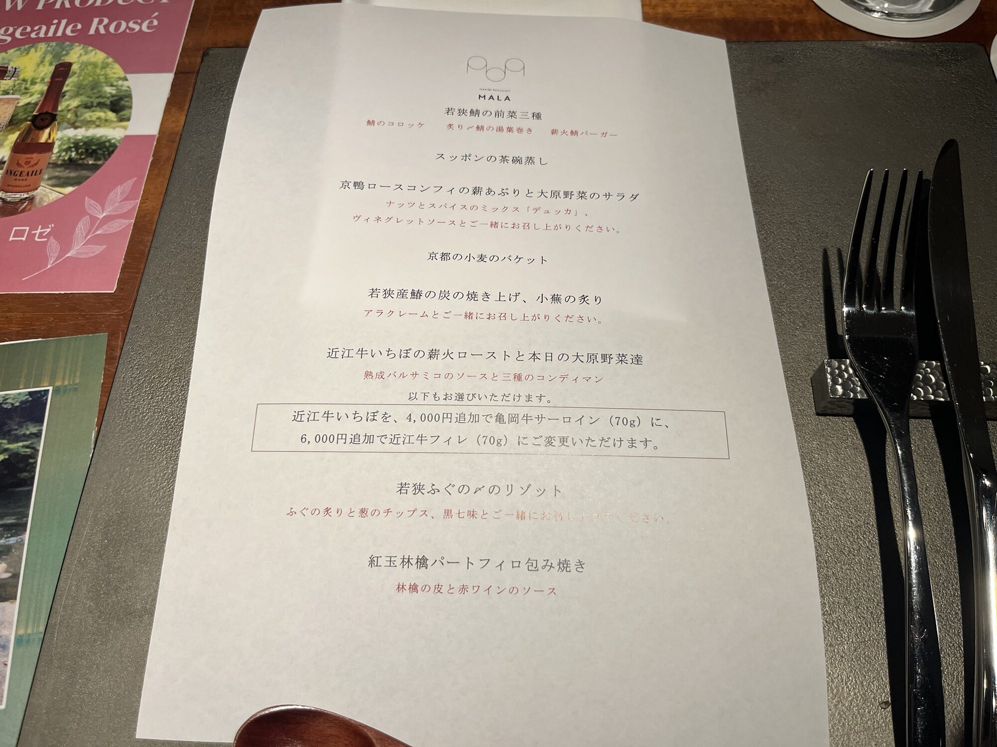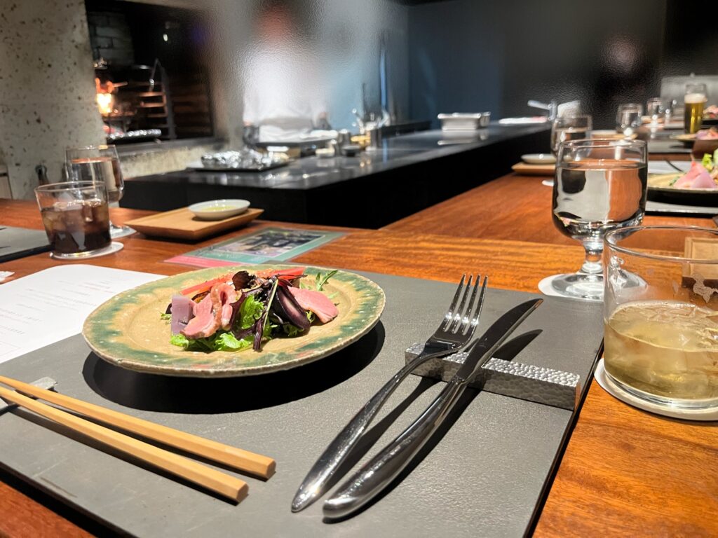 ディナーは薪火料理レストラン「MALA(マーラ)」でいただきました。レストランはオープンキッチンになっていて、カウンター席からはシェフが目の前で調理する姿を間近に眺めることができます。