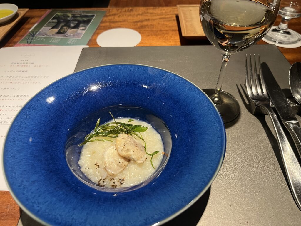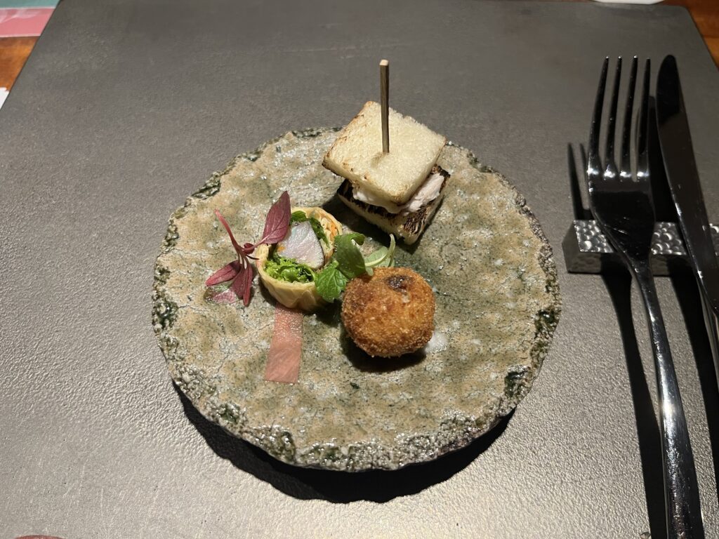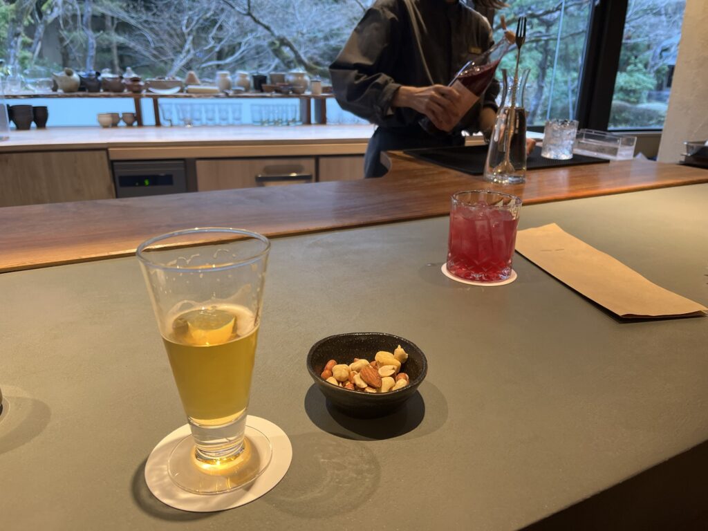 一杯目はこちらのホテルのシグネチャードリンクでもある「いり番茶ジントニック」をいただきました。その後はお料理に合わせて白ワイン、赤ワインをいただきました。オールインクルーシブなので、ペアリングを自由に楽しめるのも大きな魅力です。