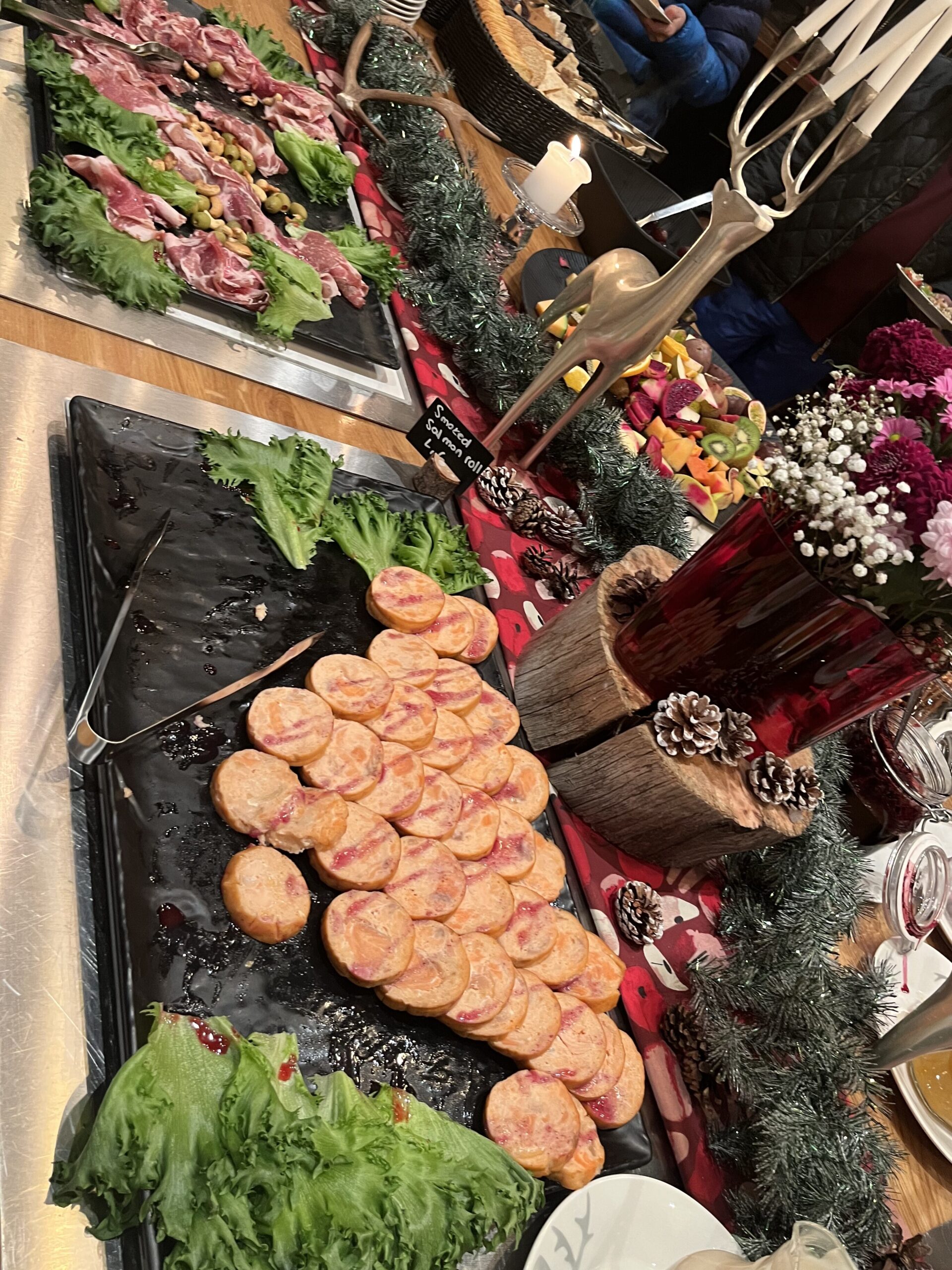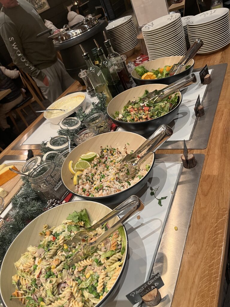 朝・昼・晩、好きな時間に好きなタイミングで食事をいただけるのもありがたかったです。ビュッフェはこんな感じでした。肉・野菜・魚・果物などバランスよく食べることができます。