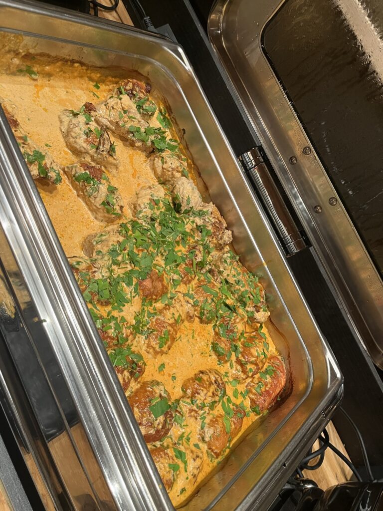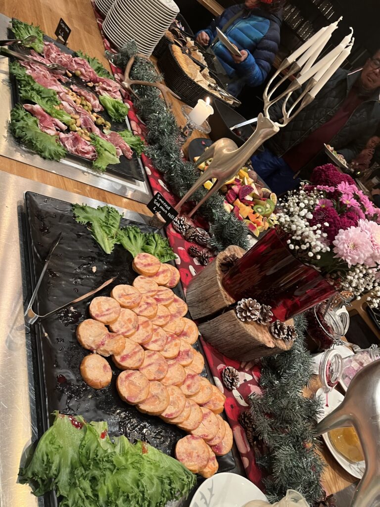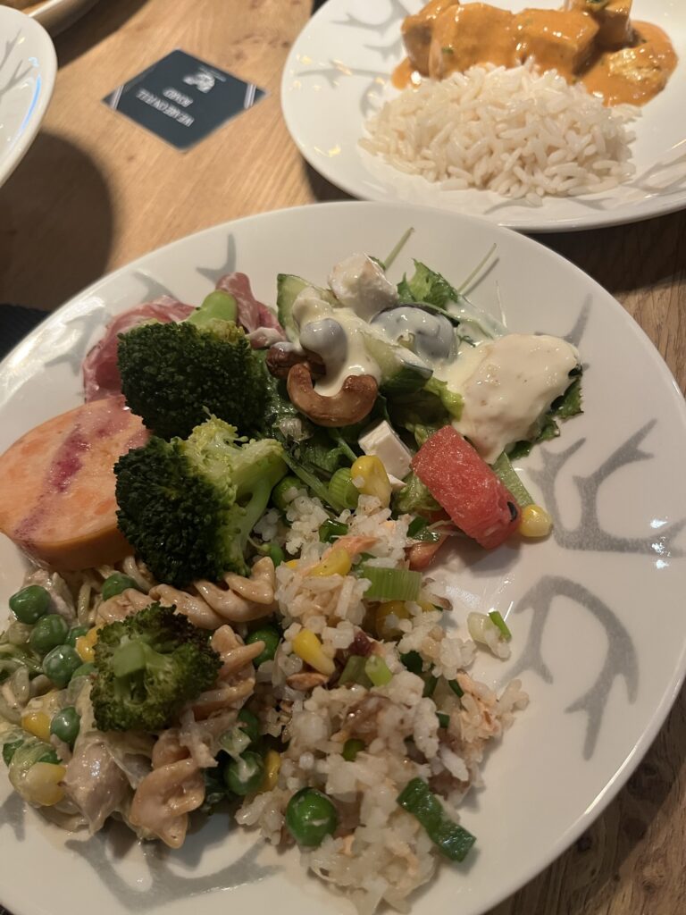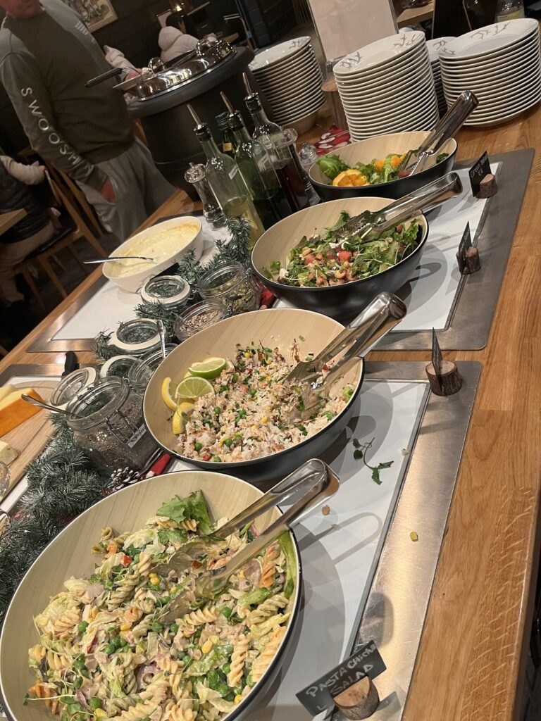 宿の周辺は飲食店などはありません。朝・昼・晩、好きな時間に好きなタイミングで食事をいただけるのもありがたかったです。ビュッフェはこんな感じでした。肉・野菜・魚・果物などバランスよく食べることができます。